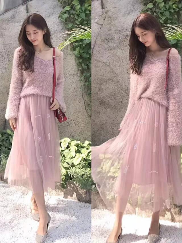 粉色毛衣+粉色纱裙毛茸茸的粉色毛衣看起来软萌又可爱。淡淡的粉色加之基础的宽松版型,上身也是有一种温柔又慵懒大气的感觉。