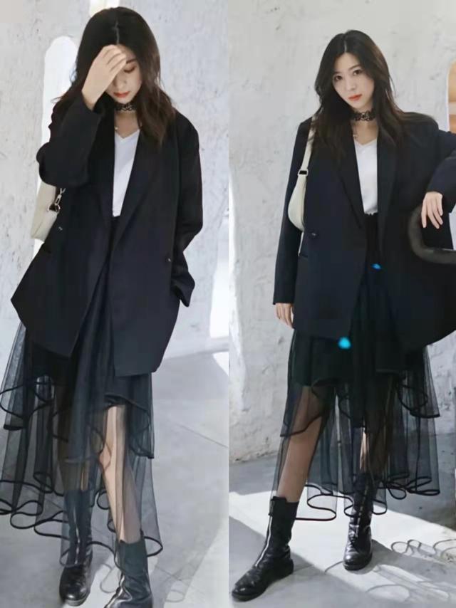 黑西装+白T恤+黑色纱裙黑色的纱裙拥有甜美梦幻感的同时,极具包容性的中性色看着还有一丢丢的低调神秘,很适合让我们用来打造高冷酷帅或者是有点小暗黑画风的“甜酷感”穿搭。