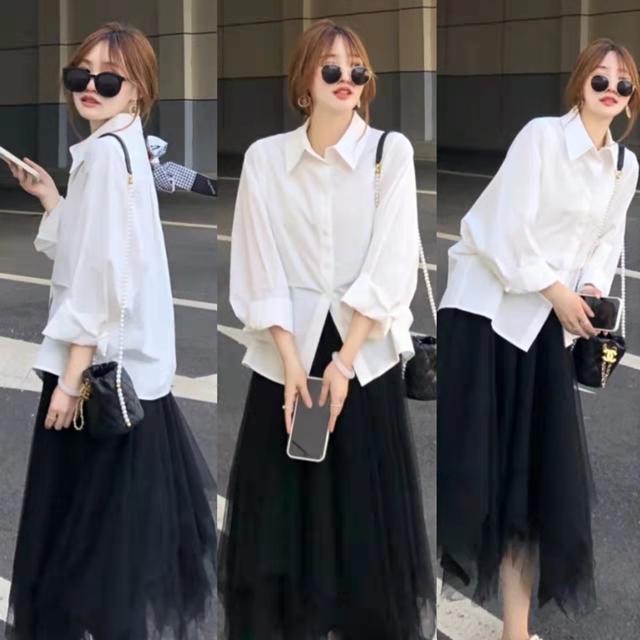 白衬衫+黑色纱裙基础款的白衬衫,上身干净又利落,很是简约大气。采用经典又耐看的“黑白”配色方式,搭配一条黑色的纱裙,纱裙裙摆错落有致、满满的设计感。