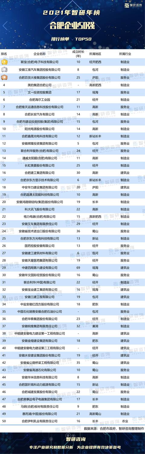 合肥市政府发布了“2021合肥企业50强排行榜”,榜单以合肥企业2020年营收为依据进行排序。
