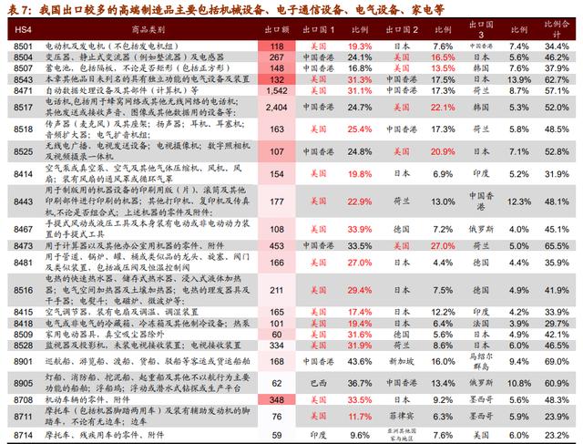 对于原材料和市场均在国外的产品,其中低附加值的商品,主要包括纺织服装、钢铁、 塑料、鞋类、家具,对美出口占比达到 24%,极度依赖美国市场,纺织服装、钢铁出口 额最大。高附加值的产品,对美国市场依赖度也比较高,如通信电子设备中的便携式电 脑、平板电脑、通信模块等,对美出口占比达 25.6%,家电、电气设备、机械设备、船 舶、摩托车与汽车零部件出口额也较大。