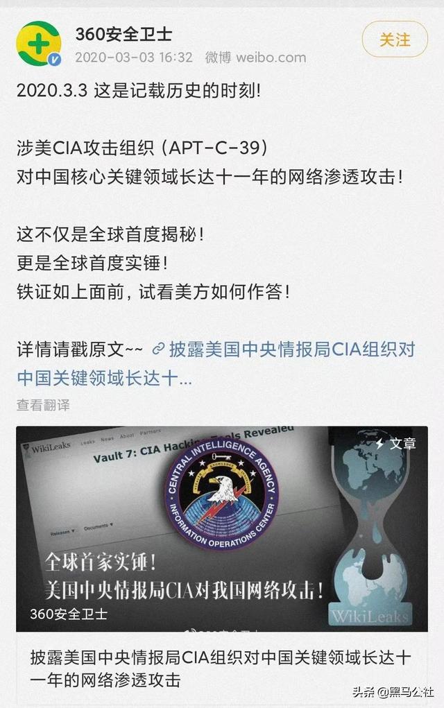 2020年3月3日,360安全卫士官方微博发布了一条博文,首次证实了涉美CIA攻击组织(APT-C-39)对中国核心关键领域长达十一年的网络渗透攻击。
