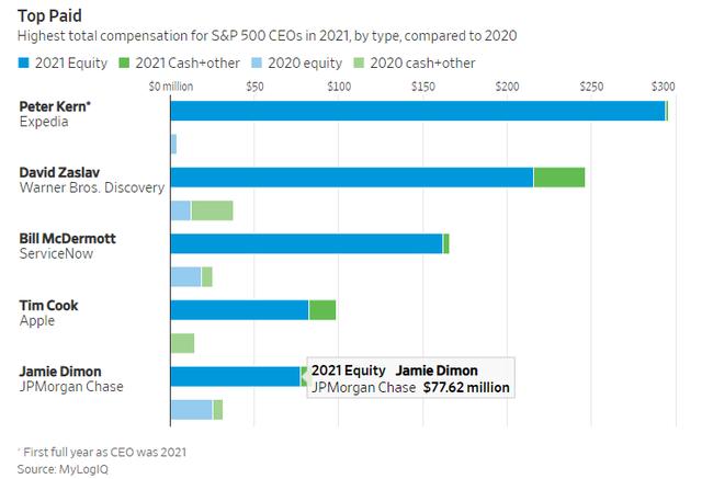 同样名列前茅的摩根大通(JPMorgan Chase & Co.)CEO杰米•戴蒙(Jamie Dimon)也至少需要再等五年,才能行使该公司价值5,260万美元的期权,并需再额外持有由此产生的股票5年,这相当于他2021年薪酬8,440万美元的近三分之二。在此期间,除去特别奖金,戴蒙的薪酬涨幅不到0.5%。