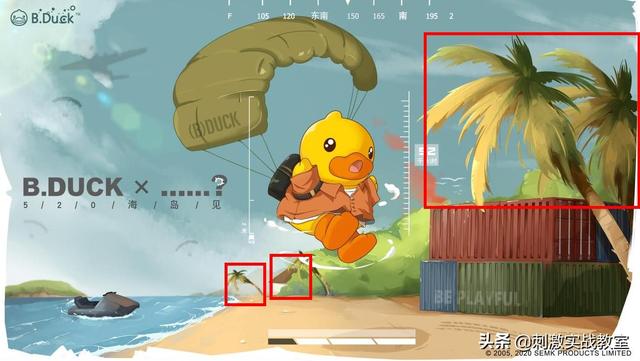 通过红色方框圈出的地方,我们可以明显看到房屋的造型,以及椰子树的造型。都可以看到《和平精英》夏日模式的身影。