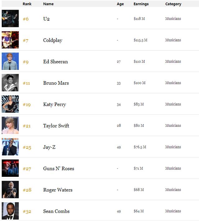 音乐人榜单的第4到第名依次是:火星哥(布鲁诺·马尔斯)、水果姐(凯蒂·佩里)、霉霉(泰勒·斯威夫特)、说唱歌手JAY-Z、枪炮与玫瑰乐队、摇滚歌手罗格·沃特斯、吹牛老爹。
