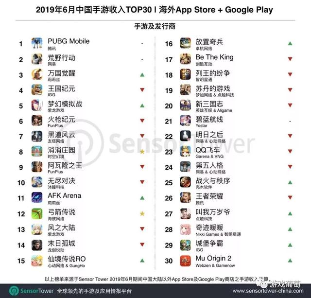 同样据Sensor Tower的统计,莉莉丝的《万国觉醒》和《AFK Arena》也分别位列2019年6月中国手游出海收入榜的第3名和第11名。而位列《万国觉醒》之前的,只有《PUBG Mobile》和《荒野行动》。