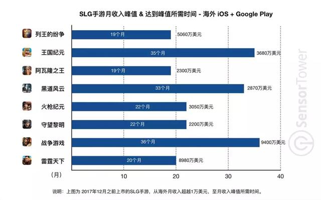 SLG海外争夺已经变成中国厂商的内战根据SensorTower报告来看,目前SLG手游普遍回收周期较长,但其回报也相当可观。从统计来看,2017年12月之前上市的SLG手游,从海外月流水超过1万美元,至月收入达到峰值所需要的时间平均为20个月,收入达到峰值。