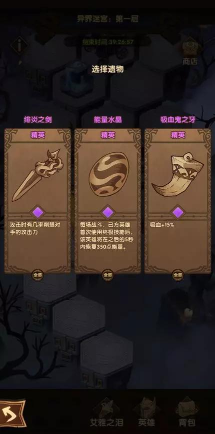 比较有趣的是遗物设计,每隔几个阶段,你都可以从三个遗物选择其一,它可以存在到活动结束。这些遗物可以给特定类型的英雄带来加成,主要是为了让玩家在活动期间多使用特定类别的英雄。该活动每48小时重置一次,所以玩家面临时间压力。