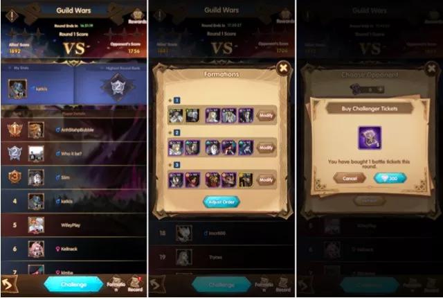 进入战斗阶段后,公会战分为五轮,每轮持续一整天。玩家使用战斗门票与对方战斗,而且每个玩家的战斗门票是有限制的。公会战每次都分为三轮不同形式的战斗。玩家们在自己的英雄当中组建三个队伍与对方战斗,值得注意的是,公会战当中的英雄会自动升级到160,并且拥有最强装备,确保了战斗的公平性。