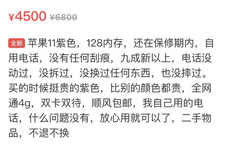 比如今天这台iPhone11 128GB,要价4500元!很多网友质疑,平台全新机才多少钱,卖得出去才怪!