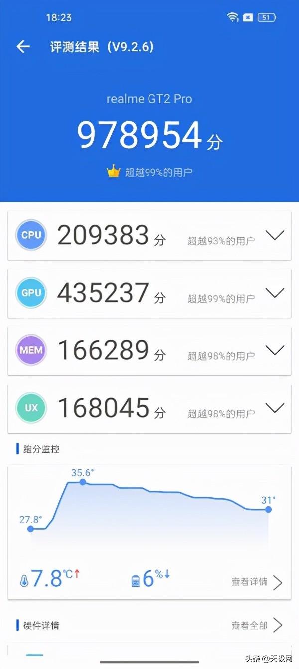 存储配置方面,真我GT2 Pro提供8GB/12GB RAM和256GB/512GB ROM三种存储组合。笔者手中的版本为12GB+256GB。测试软件选择最新版安兔兔和AndroBench。在安兔兔性能测试中,真我GT2 Pro的总得分为978954。AndroBench的ROM性能测试中,连续读写分别是1789.5MB/s和1277.6MB/s。