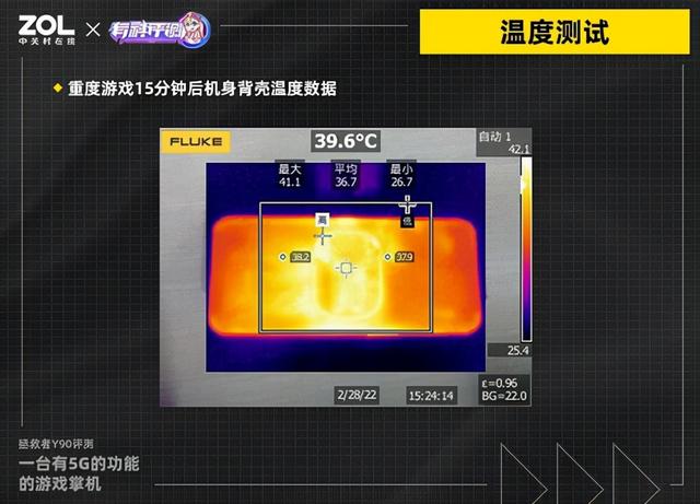 根据使用专业仪器进行的实际测试,在开启双擎风冷功能的情况下进行15分钟高强度的游戏实测之后,经过测量拯救者Y90后盖的平均温度为39.6摄氏度,从热成像图中也可以看到整个机身背部并没有出现温度过高的单点发热源,可以说其散热表现达到了当下智能手机中的顶级水准。
