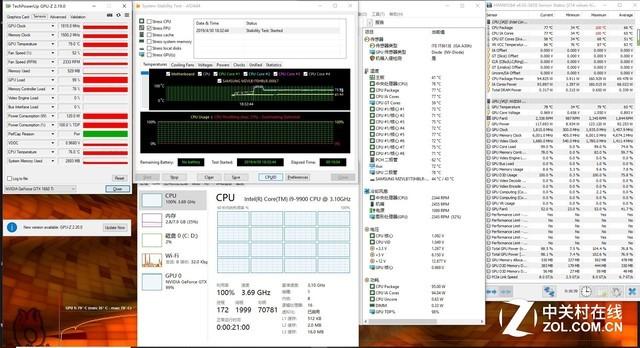 散热部分,我进行了双拷测试。软件包括AIDA64的系统稳定性测试(勾选Stress FPU)和Furmark(1920×1080,8X MSAA)。双拷过程可分为两部分,第一部分为性能爆发期,集中在约40秒之前(时间可能变化,基本在1分钟以内),此时处理器和显卡达到最高性能状态,其中i9-9900频率为4.27GHz,温度在3秒左右上升至100°,之后保持在100°,此时功耗高达161W;GTX1660Ti频率为1815MHz,温度上升至78°并保持,功耗达到近120W。