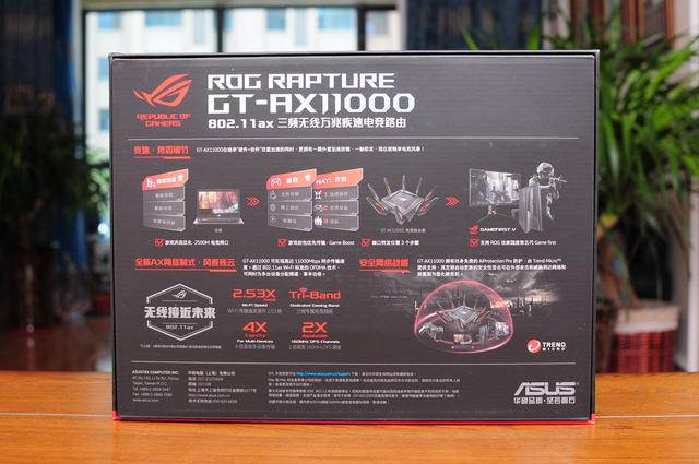 ROG GT-AX11000万兆电竞路由器的外包装充满了ROG风,之前ROG是主板所特有的,想必是华硕在主板上看到了ROG的信仰威力,所以又将ROG血统移植到了其他产品线上。对于ROG GT-AX11000万兆电竞路由器这样的旗舰级怪兽来说,和ROG品牌相结合,也算是名副其实的强强联合了。