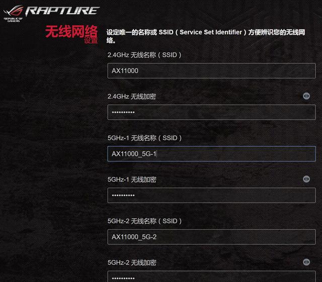 设置SSID和Wi-Fi密码,由于ROG GT-AX11000万兆电竞路由器有三个频段,所以有三组SSID和密码。