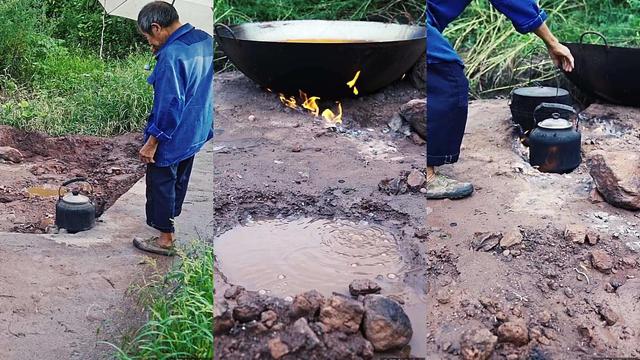 这有一个奇怪的现象:一个4米见方的土地上,七八个火坑在燃烧。无论是什么时候,这个地方都会冒火。当地人每天还会特意带水壶来这里排队烧水,也会带食物来煮。