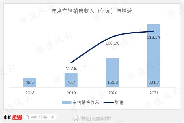 而公司年度车辆销售收入同公司的年度交付量数据一样,不仅创造了新高,两年来的增速也保持在100%以上,去年的增速更是创新高。