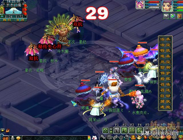 前排左侧灵符女娲 | 固定门派WDD,一直使用夺魄令干扰玩家 |