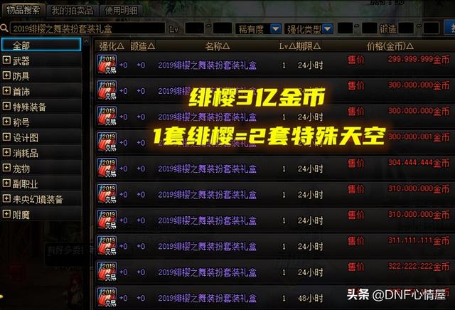 最让玩家吃惊的,非“天纵云霄”稀有天空价格,而是绯樱之舞!2019年产出的一套装扮,每次奇迹缝纫机中,都是压轴的时装,这次同样不例外。相比较以往奇迹缝纫机,此次价格大幅上涨,绯樱装扮“疯了”,3亿金币打底。