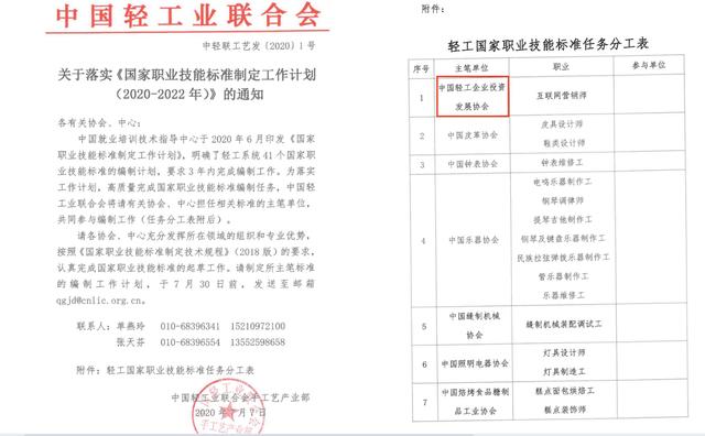 2020年6月28日人力资源和社会保障部中国就业培训指导中心《关于印发国家职业技能标准制定工作计划的通知》指定中轻联为“互联网营销师”国家职业标准的承担单位。中轻联依据该职业申报材料,批准协会为该职业国家职业标准的主笔单位。