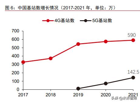 从 FTTH 来看,截止 2021 年底,中国光纤接入 FTTH/O 用户 5.06 亿,仅中国移动一 家用户数量就达到 2.4 亿。中国 FTTH/FTTO 的 用 户 比 率 达 到 93%, 相 较 于 全 球 30%的平均水平遥遥领先。FTTH 的高速发展,一方面与中国的人口基数有关,另一方 面与中国的劳动力成本和土地政策也密不可分。据中国电信集团公司科技委主任韦乐平, 中国 FTTH 的单户成本 2017 年已降到 100 美元,仅为欧美日等发达国家的 1/10。较低的 接入成本加上庞大的市场规模,使中国 FTTH 用户数量突飞猛进,根据工信部数据,到 2020 年底中国 FTTH 端口数约 9.18 亿个。 同时,中国也在不断推进 4/5G 的建设,2019-2021 年,中国共新建 5G 站点 142.5 万。在 FTTH 和基站的大规模建设共同推进下,根据《2021 年通信业统计公报》,2021 年底中国光缆总长度 5488 万公里,其中 2021 年新建 319 万公里。