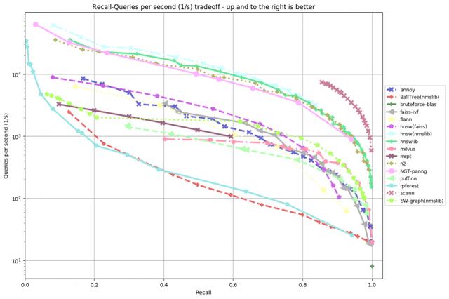 这几个问题可以以牺牲质量为代价来解决——以压缩(量化)而不是以原始形式存储嵌入层。而且还要改变搜索策略——不是使用暴力搜索,而是尝试进行最小比较次数以找到与给定查询最接近的所需比较次数。目前已经存在大量有效的搜索框架可以近似搜索最接近的内容。为实现这一目的,一个特殊的基准测试已经创建——根据这个基准你可以观测到每一种库在不同数据集上的表现。