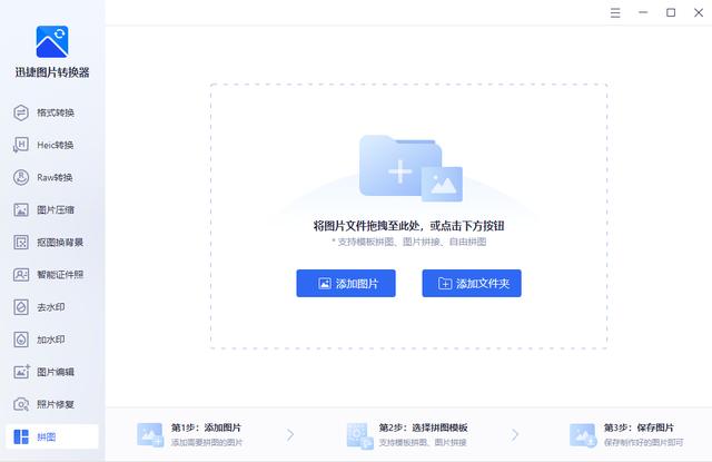 拼图功能在软件左侧功能栏的最下方,点击拼图功能,点击添加需要拼接的图片,上传成功后,软件会自动为你生成拼图,可自定义调节图片位置。