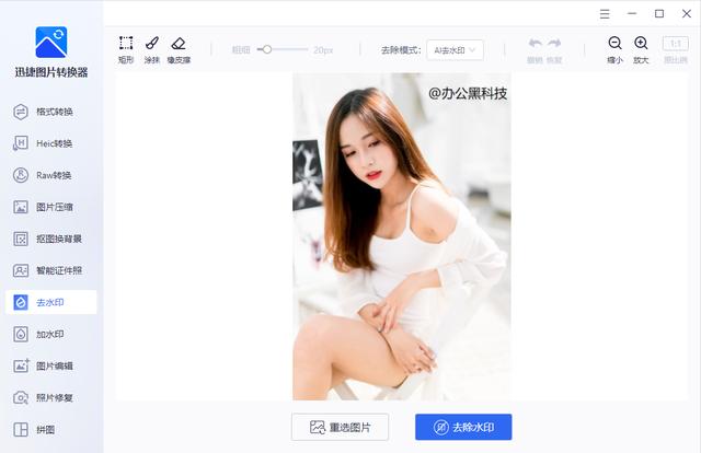 打开软件,选择去水印功能,将需要去除水印的图片添加,添加成功后,可以选择矩形、涂抹、橡皮擦三种去除方法,还有AI去水印、文里填充等4种去除模式。