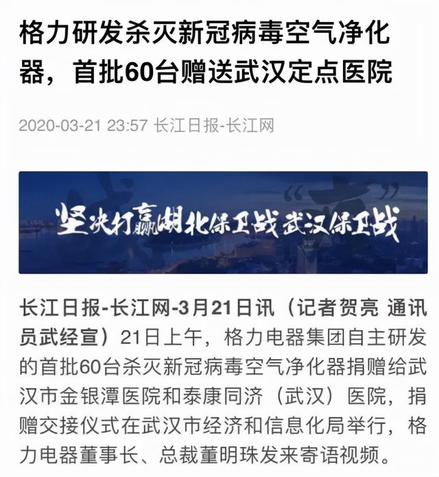1月24日晚除夕夜,湖北格力紧急调派一批技术服务工程师为武汉同济医院发热内科抢装格力空调改善工作环境。东莞格力为东莞疾病预防控制中心捐赠一批空气净化器。
