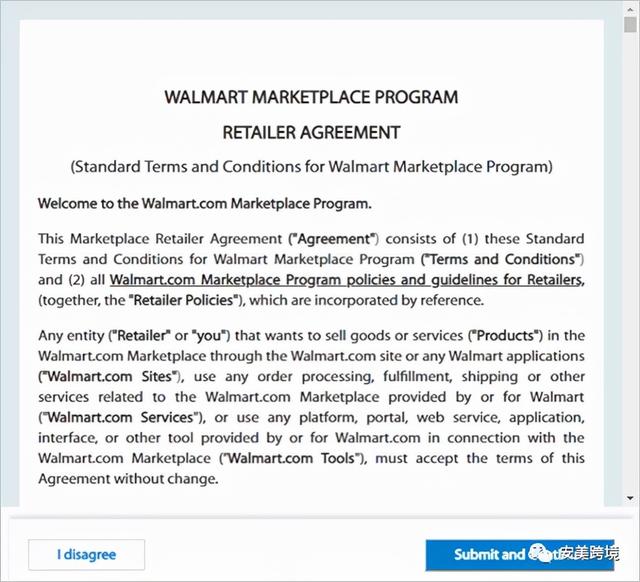 紧接第 1 步之后,您将看到沃尔玛零售商协议。仔细查看沃尔玛市场计划零售商协议。这是所有市场卖家签署的法律协议。