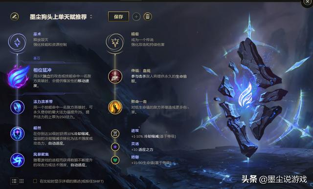 想要玩好这个英雄不容易,为了更好的叙述上单狗头的对局思路,墨尘将从天赋与召唤师技能、加点方式、出装思路以及出山时间,这四个大点来对狗头进行一个全面的攻略介绍。