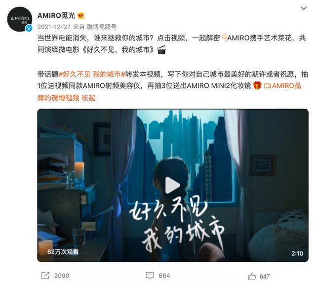 2021 年 12 月底,AMIRO 发布一则合作博主@艺术菜花的微电影,通过超现实故事,讲述人类皮肤因很久没有新的能量注入而发生衰老等情况,以此和 AMIRO 的产品、技术相结合。