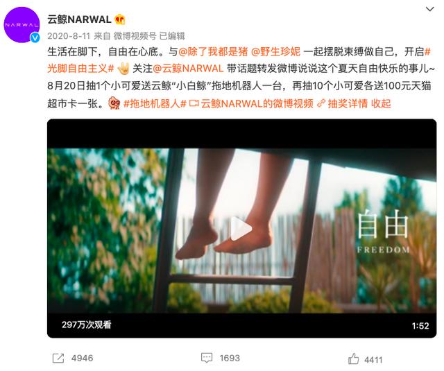 刀法研究所向云鲸 CMO 阎乐了解到,在内部复盘中,2020 年夏季的“光脚自由主义”主题活动一直被视为云鲸打响的微博营销「第一战」。