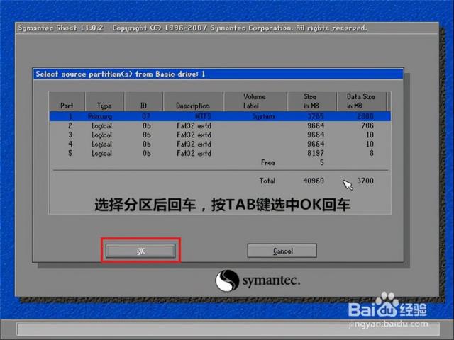 4.选择需要备份的分区(第一分区为系统分区),单击“OK”