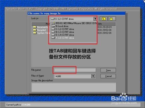 5.选择备份文件存放的位置。(不能选择要备份的那个分区)。输入备份文件名,扩展名是.GHO,单击“SAVE保存”