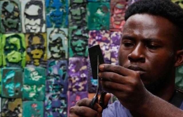 只有库梅知道这些“垃圾”的真正价值,他会把旧鞋上的橡胶和塑料鞋底切割成碎片,然后用这些“边角料”制作成大型拼贴画。通过他的艺术创作,有些画甚至卖到了1000美元的高价。