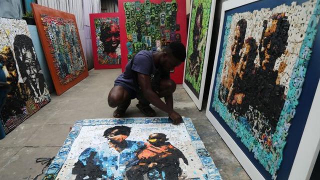 来自非洲象牙海岸的一名艺术家发现了一种变废为宝的秘诀——用冲到岸边的废旧拖鞋制作艺术品。
