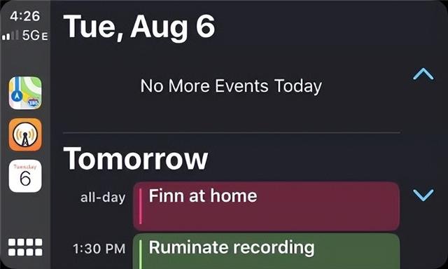 新增日历应用,这是 iOS 13 中 CarPlay 唯一的一个全新应用程序。从 UI 和功能设计上来看,CarPlay 的日历应用就像是 iOS 版本的简化版,因为它只提供少数即将发生事件的预览,你无法查看更早的事件或者创建新事件,点击某个事件之后会打开详细信息,显示开始和结束的时间,而且如果这个事件和某个地理位置相关联的话,也会显示相应的地理位置信息,点击之后会直接跳转至地图中查看。