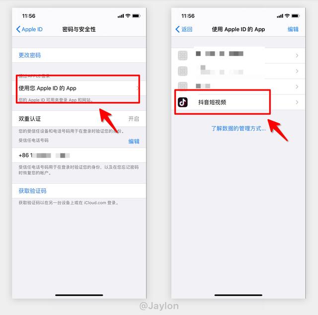 将会看到一个选项,叫「使用您的 Apple ID 的 App」,点击进入,将会看到已经授权登录的APP应用列表们。(比如这里有个「抖音短视频」)