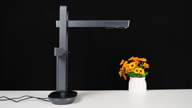细节方面,扫描仪设备主体由支架、头壳、底座三部分组成,既可以当作扫描仪来使用,也可以当作台灯使用。外壳材质选用的是铝合金,灰色的配色符合办公场景,支架顶部还是个隐藏提手的设计,方便移动位置。