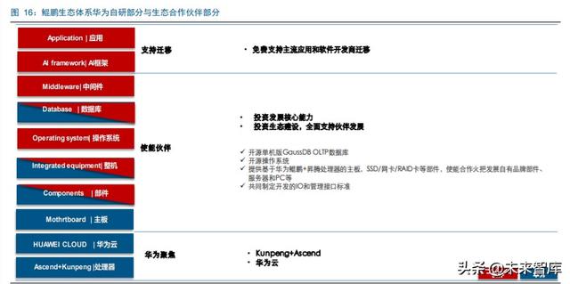整个鲲鹏计算生态中华为的定位更加偏向于中国 Intel,主要聚焦在芯片以及云端,持续 推进处理器研发与架构演进,除了整机、部件、数据库端会有少量涉及外,其它领域均 交由合作伙伴承接,