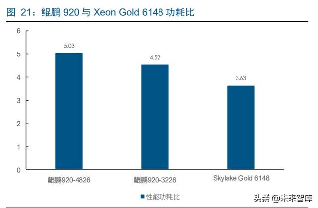 性能对标 Xeon Gold 6148 功耗降低 20%,华为鲲鹏 920 基础 32 核 2.6GHZ 性能匹 配 Xeon Gold 6148 芯片(2017 年中发布),但是功耗降低 20%,根据华为官网的数据 显示鲲鹏 920-3226 在性能上基本与 Xeon Gold 6148 匹配,更强大的鲲鹏 920-4286 性 能大幅领先,在功耗方面鲲鹏 920 优势显著,鲲鹏 920 4286、鲲鹏 920 3226、Xeon Gold 6148 功耗比分别为 5.03、4.52、3.63 性价比优势凸显。
