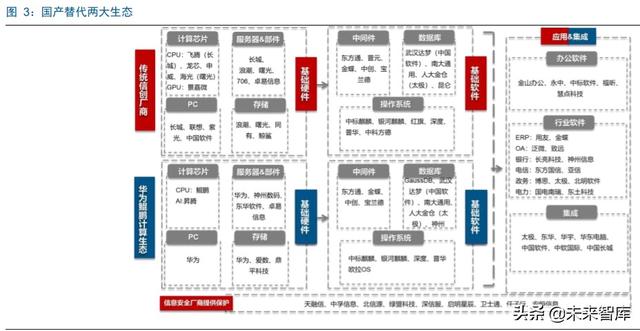 中美科技角力,国产化大势所趋。2019 年开始美国先后对中兴、华为、中科曙光、海康 威视、科大讯飞等国内科技领军企业进行制裁和禁运,美国利用自身在 IT 基础软硬件 领域的技术优势遏制国内科技产业发展之心昭然若揭,国内 IT 核心技术缺失导致科技 产业受制于人的现状显露无遗,未来构建国内自主创新的 IT 生态将是未来中国科技产 业发展的必由之路,预计 IT 产业将在政策、资金、资源等层面获得倾斜与扶持。此前我 国国产替代主要以中国软件、中国长城、龙芯为代表的传统信创体系。2019 年华为携 鲲鹏切入国产替代,凭借华为强大的技术实力有望大大加速国产替代的进程。