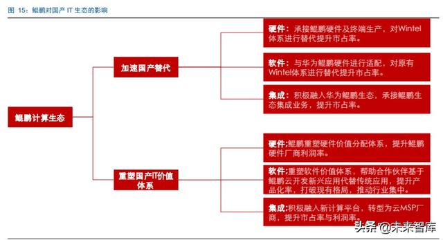 鲲鹏不只是替代更是重构 IT 生态,鲲鹏计算生态强势入局国产 IT 替代将对整个国产 IT 的发展产生深远的影响,一方面凭借鲲鹏优异的性能以及华为强大的产业协调与生态支 持能力,鲲鹏将加速整个国产软件生态的替代进程,此外更重要的是通过搭建新的计算 平台,华为或将改变国产 IT 长期低附加值与高定制化的现状,重塑整个国产 IT 的价值 分配体系。