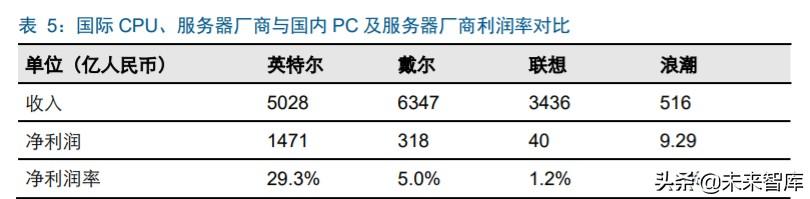 由于缺失核心 CPU 设计及生态构建能力,从盈利能力和体量可以看出,以个人 PC 为 主的联想集团和以服务器为主的浪潮集信息处于生态产业链价值分配末端。