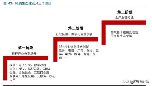 从关键行业试点到全行业、全场景渗透,打造开放、共享的生态体系是鲲鹏计算生态的 基础与目标,华为计划分为三个阶段,