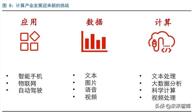 通用芯片难以应对复杂的场景和海量数据,5G 在与传统行业融合催生海量数据的同时, 下游数据的多样性也大大增强,根据 GIV 的数据显示 2025 年新增数据的 95%均为图 片、文本、语音、视频等非结构化数据,海量非结构化数据带来文本处理、大数据分析、科学计算处理等多元的化的计算需求,日益复杂且多元的计算需求给单一通用芯片架构 构建的传统计算体系带来了巨大的挑战。