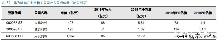 计算机产业链自下而上主要分为芯片、基础硬件、基础软件、应用软件、软件服务等五 个环节,鲲鹏芯片端完全由华为自己承担,其余完全或部分交由合作伙伴承接,我们从 基础硬件、基础软件、应用软件、软件服务四个维度对鲲鹏计算产业链相关上市公司进 行了梳理,详情如下: