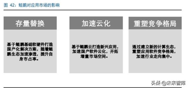 鲲鹏带动国产应用软件全面崛起,国内 IT 行业长期存在重硬轻软、定制化程度高的现 状,随着鲲鹏计算体系不断完善将建立新的行业标准与模式,有望重塑企业应用软件竞 争格局与价值分配体系,鲲鹏对应用端的影响主要体现在三个方面,1)国产化带动存 量替换提升市占率;2)基于鲲鹏云服务开发配套应用,加速国产软件云化进程;3)重 塑应用软件竞争格局,加速行业走向集中。