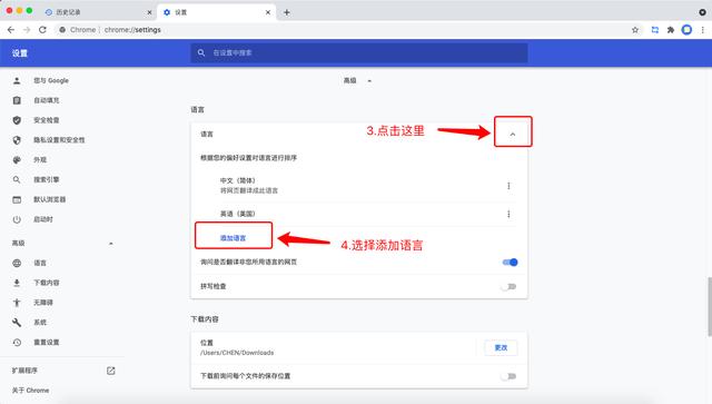 3.点击chrome浏览器右上角的菜单按钮→选择“设置”→高级→语言→添加日语并置顶同时移除其他语言,如果通过步骤2查询你的IP是其他国家,就添加应该国家的语言即可。完成这个步骤以后再次清楚浏览缓存,并关闭浏览器,